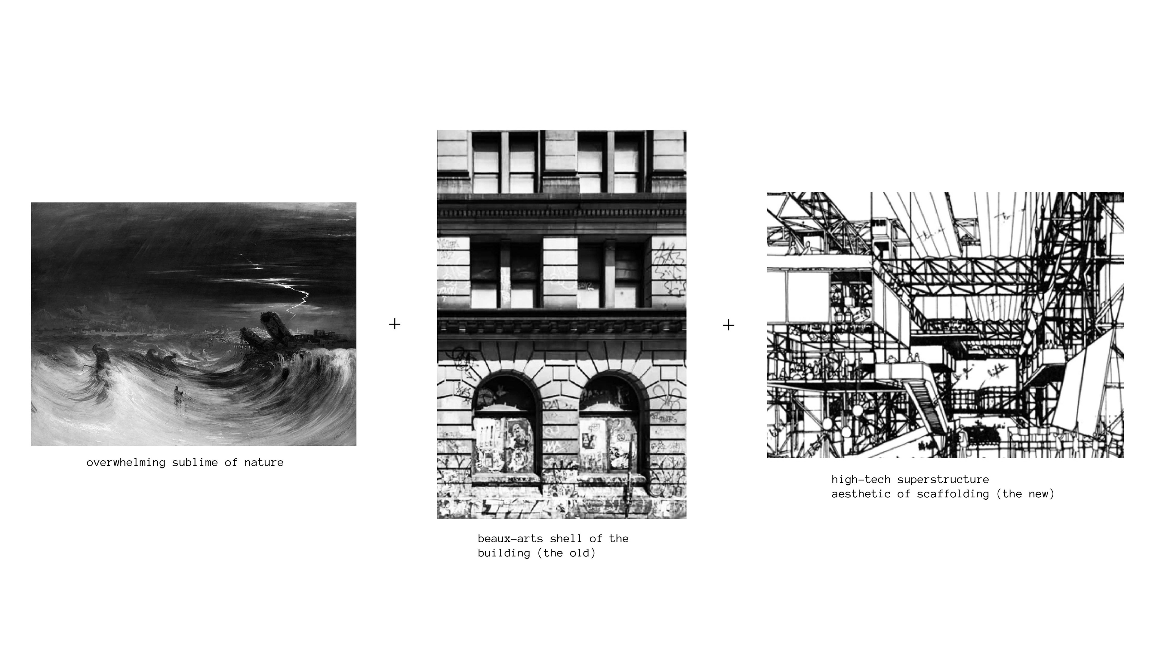 on the site of 190 bowery, lives the historic germania bank building. the building acted as an economic and cultural landmark for the immigrant german community of the area, and was designed in the beaux-arts style to uphold ideals of wealth and growth. all throughout the project, the relationship between nature, the public, and the history of architecture in new york are in dialogue with one another, and ask the public to take part in that conversation, all while learning about the natural world that they don’t have day to day access to. the juxtaposition of the old and the new, the dark and the light, the heavy and the weightless, all put in tension the experience of public space in a building that at one point was a landmark for a new community in the city. the darkness and obscurity placed in the scale of the space such as the germania building elicit the sublime as well.